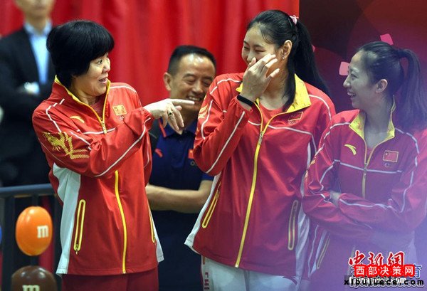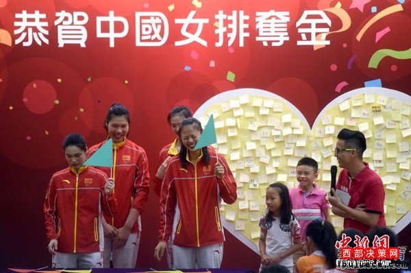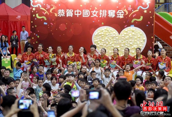北京時間8月28日,女排隊員在香港與市民見面。見面會上女排姑娘與當?shù)貎和M行了互動游戲,女排主教練郎平幽默扮鬼臉令人捧腹大笑。