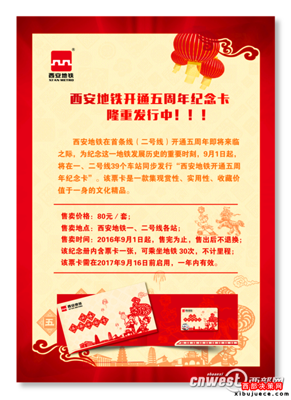 9月1日起,西安地鐵將在一、二號(hào)線39座車站同步發(fā)行“西安地鐵開通5周年紀(jì)念卡”,售價(jià)80元。