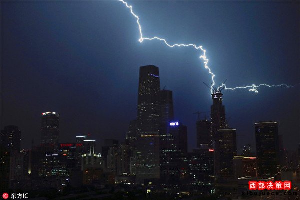 2016年9月7日,中國北京,夜幕降臨,一道道打雷閃電劃破京城夜空,觸目驚心。據(jù)北京市氣象局官方微博消息,北京市氣象臺7日17時45分發(fā)布雷電黃色預警信號。