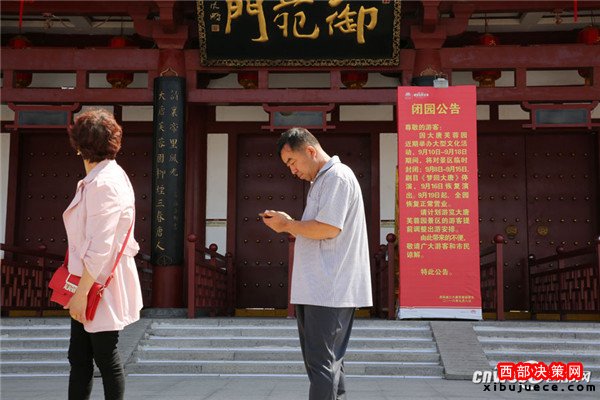 9月11日,西安大唐芙蓉園御苑門外,雙龍戲珠巨型花壇顯得格外喜慶。緊閉的大門口貼著閉園公告,因9月15日晚央視在大唐芙蓉園內(nèi)舉辦中秋晚會,9月10日至9月18日期間,大唐芙蓉園臨時封閉。
