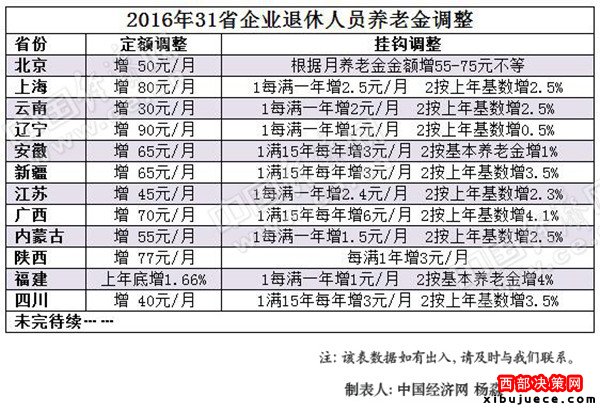據(jù)統(tǒng)計,已公布方案的省份多采用定額調(diào)整、掛鉤調(diào)整與適當(dāng)傾斜相結(jié)合的調(diào)整辦法。對于企業(yè)退休人員來講,單就定額調(diào)整,遼寧省每人每月調(diào)整金額相對最高,增加90元,云南省定額調(diào)整數(shù)額相對較少,增加30元每月。