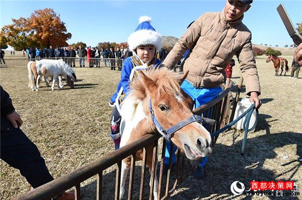 蒙古族小朋友在與迷你馬玩耍。
