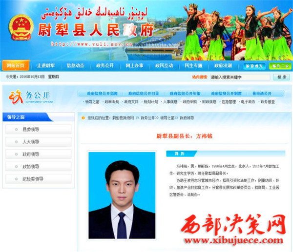 尉犁縣官網上公布的方祎銘簡歷