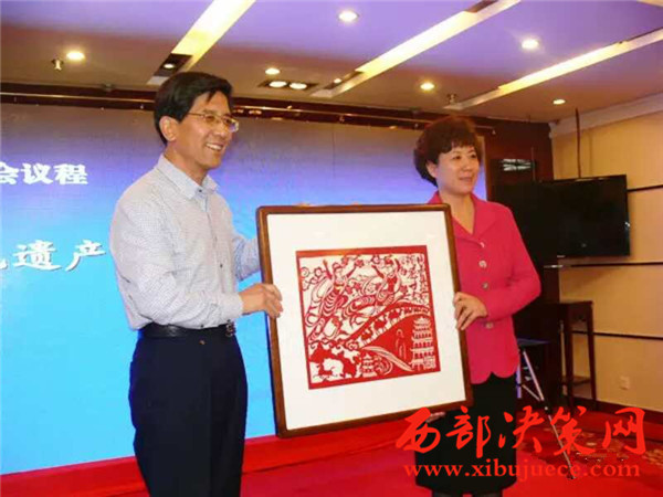 平?jīng)鍪姓笔虚L(zhǎng)李生發(fā)向參會(huì)各?。▍^(qū))代表贈(zèng)送平?jīng)黾艏埶囆g(shù)作品