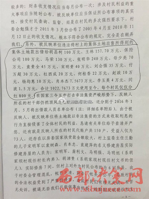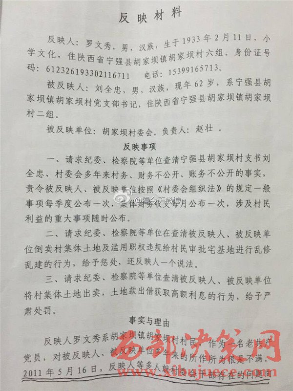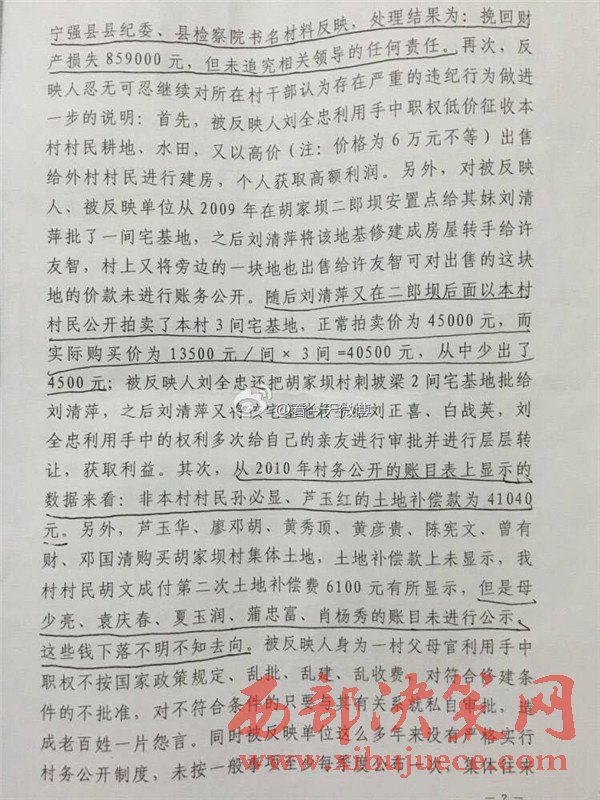 西部決策網(wǎng)訊 近日,有網(wǎng)友微博爆料,陜西省漢中市寧強縣胡家壩鎮(zhèn)胡家壩村,村干部劉全忠利用惠民政策,套取國家大量資金。對于國家扶貧項目,巧立名目、貪污、侵占村民利益。濫用職權違規(guī)審批宅基地,倒賣村集體土地,并將村上千萬余元出借他人賺取利息,且村務不公開、賬務弄虛作假、嚴重違紀行為。