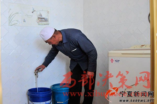 在海原水務(wù)局曹洼水利工作站站長(zhǎng)牛志遠(yuǎn)的帶領(lǐng)下,我們來(lái)到了白崖村村民馬正海的家。這是個(gè)干凈整潔的院落,兩間并排的磚瓦房,步入屋內(nèi),馬正海正在教老伴如何使用洗衣機(jī)。“50多歲了第一次用洗衣機(jī),還不會(huì)操作呢” ,馬正海的老伴笑著說(shuō),“今年4月家里通上自來(lái)水,前陣子就去買(mǎi)了臺(tái)洗衣機(jī),這在之前想都不敢想。”
