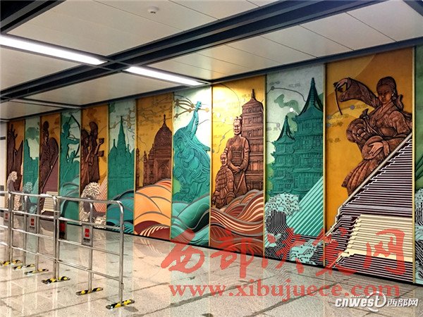 小寨地鐵站的文化墻上,除了有長安的大雁塔、兵馬俑外,還有行走在絲路上的駱駝、以及絲路使者,既彰顯了長安的歷史文化又體現(xiàn)了絲路元素。
