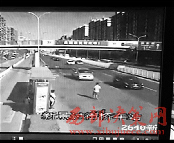 這段不到5秒鐘的視頻翻拍自事發(fā)現(xiàn)場的一個(gè)監(jiān)控?cái)z像頭,視頻正對的方向是一個(gè)公交站臺(tái)和機(jī)動(dòng)車道。