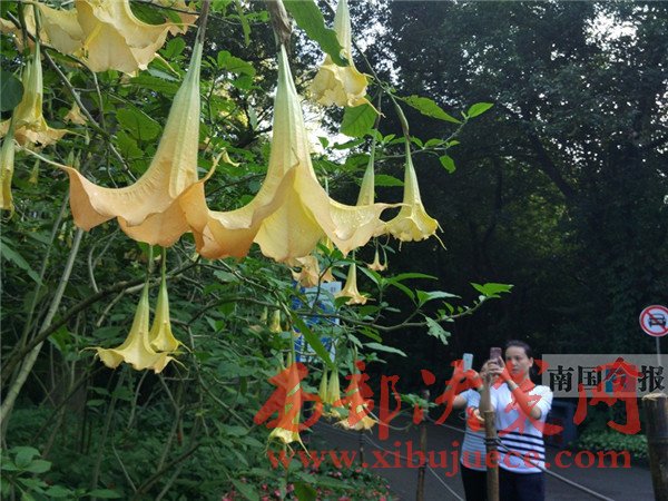 “南瓜花不是長在藤蔓上的嗎,怎么這些‘南瓜花’都倒吊著長在了樹枝上?”昨日,柳州市龍?zhí)豆珗@里的不少游客,都被路旁一種奇異的開花樹木所吸引,紛紛駐足觀賞拍照。記者了解到,那是公園新近引種的木本曼陀羅,因為屬于有毒植物,市民前往觀賞時,最好眼看手勿動。