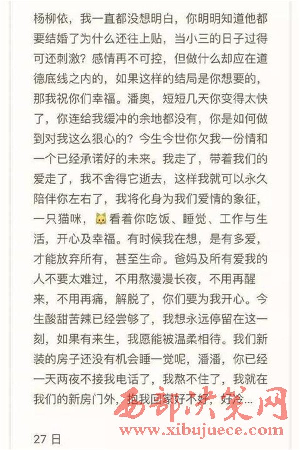 次日凌晨1點20分,段丹峰在朋友圈發(fā)布長文,表達(dá)因感情問題意欲輕生,并配有一張與潘奧相擁的親密合影。在朋友圈中,段丹峰寫道,潘奧有新歡楊某,短短幾 天變化太快,沒有給她留下緩沖的余地,潘奧已經(jīng)一天兩夜沒接她電話,自己此刻正在新房外。據(jù)段丹峰朋友介紹,與潘奧的合影正是今年9月初,兩人去給朋友當(dāng) 伴郎伴娘,在別人婚禮上,潘奧曾向她求婚。