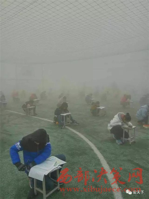 投訴人閆先生給記者發(fā)來兩張照片,照片顯示,天氣灰蒙蒙的,在一個(gè)露天的足球場(chǎng)上,很多學(xué)生半蹲著趴在凳子上做卷子,由于霧霾太大,第2排后面的學(xué)生身影已經(jīng)很模糊。20日下午3時(shí)50分左右,大河報(bào)記者趕到林州,當(dāng)?shù)氐目諝忪F霾十分嚴(yán)重,能見度只有二三百米。在臨淇鎮(zhèn)一中學(xué)校附近,記者見到了閆先生。他告訴記者,現(xiàn)在學(xué)校已經(jīng)知道記者要來采訪了,臨時(shí)放假了,考試也取消了。隨后,在校門口,該校八年級(jí)的一名學(xué)生告訴記者,學(xué)校確實(shí)確實(shí)在12月19日考試了,上午考英語和數(shù)學(xué),下午考語文和物理。該學(xué)生告訴記者,八年級(jí)共十個(gè)班,每個(gè)班六七十人,大家都參加了考試,“在操場(chǎng)上考的,搬著凳子在外面”。