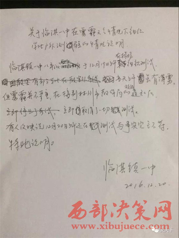 馮校長出示了一份手寫的情況說明:臨淇鎮(zhèn)一中八年級(jí)于12月19日上午在操場(chǎng)組織測(cè)試,當(dāng)天上午雖有薄霧,但霧霾并不嚴(yán)重,在接到林州市教體局的通知后立即取消了一切測(cè)試。有人反映說12月20日上午還在測(cè)試,與事實(shí)完全不符。特此說明。“為什么有學(xué)生說19日下午也考試了?”記者追問,并說出了考試的科目。馮校長尷尬地笑笑:“組織都組織了,就考完吧。”據(jù)馮校長介紹,當(dāng)時(shí)并沒有這么多學(xué)生在操場(chǎng)考試,有一部分學(xué)生在教室考的,在操場(chǎng)上考試的只有480多名學(xué)生。到底是什么樣的考試如此急迫,讓學(xué)生頂著霧霾也要進(jìn)行?馮校長說,學(xué)生課講完了,這次考試是一個(gè)摸底測(cè)驗(yàn)考試,也沒有那么急迫。
