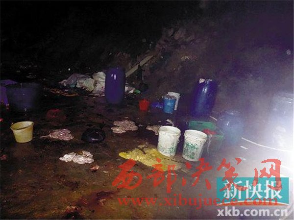 在查獲現(xiàn)場(chǎng),違法人員臨時(shí)搭建的私宰帳篷里,地上鋪滿(mǎn)了豬血和豬毛的混合物,生豬糞便隨著水流漸漸形成一條“小河”流向遠(yuǎn)處,殺豬刀、鐵鉤、鐵叉等用于私宰的工具隨意擺放在地上,與豬毛、豬血、糞便等混合在一起。現(xiàn)場(chǎng)一口直徑近2米的大鍋盛滿(mǎn)了水,熱氣騰騰。