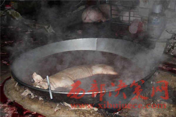 執(zhí)法人員稱(chēng),這口大鍋是用來(lái)給生豬褪毛的,隨后就在這露天的骯臟環(huán)境下進(jìn)行屠宰和分割、裝填貨車(chē),這種情況屠宰出來(lái)的豬肉其質(zhì)量可想而知。