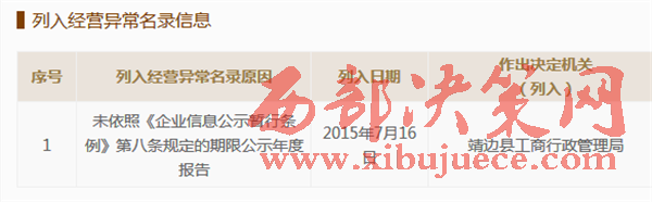 靖邊興發(fā)公司2015年7月16被工商部門(mén)列入經(jīng)營(yíng)異常名錄