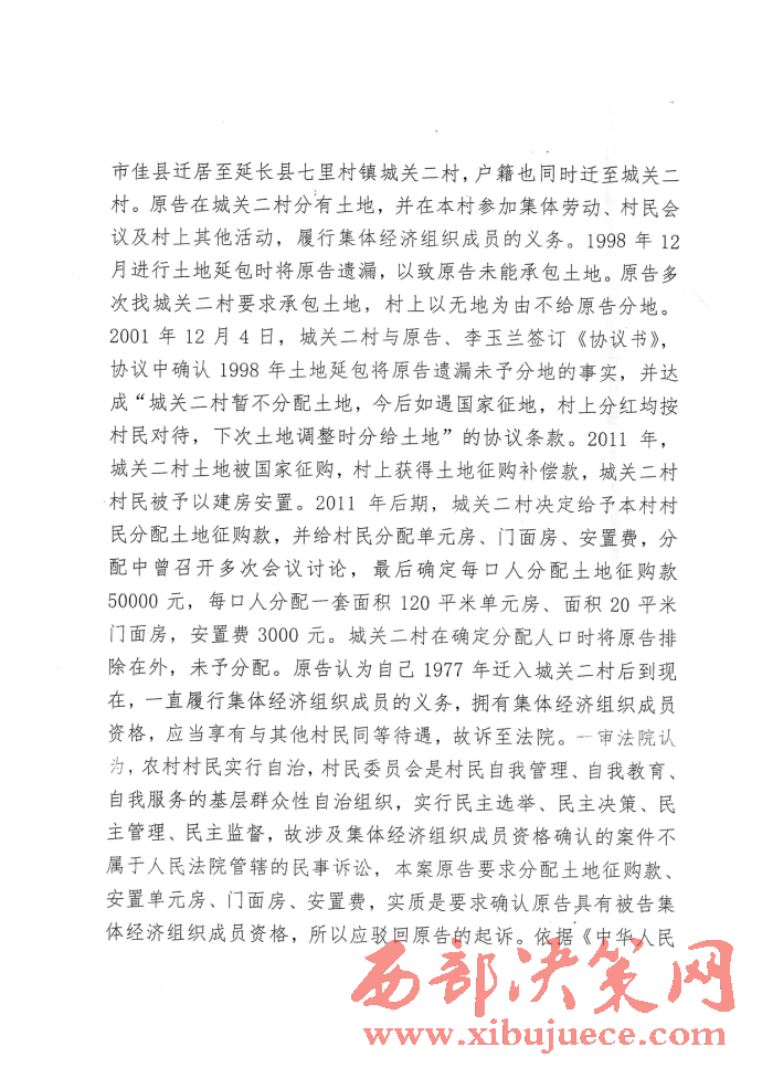 西部決策網(wǎng)訊(記者 封營(yíng)庫(kù) 實(shí)習(xí)記者 李延梅)陜西延長(zhǎng)縣七里村村民李果花反映稱(chēng):“1977年我從榆林市佳縣遷居至延長(zhǎng)縣七里村鎮(zhèn)城關(guān)二村,戶(hù)籍也同時(shí)遷至城關(guān)二村。我在城關(guān)二村分有土地,并在本村參加集體勞動(dòng)村民會(huì)議及村上其它活動(dòng),履行集體經(jīng)濟(jì)組織成員的義務(wù)。1998年12月進(jìn)行土地延包時(shí)將我遺漏,以致我未能承包土地。我多次找城關(guān)二村要求承包土地,村上以無(wú)地為由不給我分地。2001年12月4日,城關(guān)二村與我、李玉蘭簽訂《協(xié)議書(shū)》,協(xié)議中確認(rèn)1998年土地延包時(shí)將我遺漏未有分地的事實(shí),并達(dá)成“城關(guān)二村暫不分配土地,今后如遇國(guó)家征地,村上分紅均按村民對(duì)待,下次土地調(diào)整時(shí)分給土地”的協(xié)議條款。2011年,城關(guān)二村土地被國(guó)家征購(gòu),村上獲得土地征購(gòu)補(bǔ)償款,城關(guān)二村村民被予以建安置房。2011年后期,城關(guān)二村決定給予本村村民分配土地征購(gòu)款,并給村民分配單元房、門(mén)面房、安置費(fèi),分配中曾召開(kāi)多次會(huì)議討論,最后確定每口人分配土地征購(gòu)款50000元,每口人分配一套面積120平米單元房,面積20平米的門(mén)面房,安置費(fèi)5000元,城關(guān)二村在確定人口時(shí)將我排除在外,未予分配。我認(rèn)為自己1977年遷入城關(guān)二村后到現(xiàn)在,一直履行集體經(jīng)濟(jì)組織成員的義務(wù),擁有集體經(jīng)濟(jì)組織成員資格,應(yīng)當(dāng)享有與其他村民同等待遇,故訴至延長(zhǎng)縣人民法院要求判令城關(guān)二村給予我分配土地征購(gòu)款50000元,安置單元房一套(120平米)、門(mén)面房20平米,安置過(guò)渡費(fèi)5400元。但被延長(zhǎng)縣人民法院以涉及集體經(jīng)濟(jì)組織成員資格的案件不屬于人民法院管轄的民事訴訟,駁回起訴。我又上訴至延安市中級(jí)人民法院,但又用同樣的理由又被駁回上訴。我該怎么辦?真的天下烏鴉一般黑嗎?我訴訟的是要回屬于我的征地款、安置房、過(guò)渡費(fèi),我有合法的戶(hù)口簿、身份證。又有延長(zhǎng)縣城關(guān)鎮(zhèn)政府副鎮(zhèn)長(zhǎng)張世杰、包村片長(zhǎng)趙華強(qiáng)、包村干部白醫(yī)學(xué)、城關(guān)村村主任(二村村民)董志軍、二村村長(zhǎng)趙金星,原二村會(huì)計(jì)王連平,原二村代表老村長(zhǎng)丁興元,在鎮(zhèn)政府會(huì)議室簽訂的協(xié)議書(shū)。難道我的村民資格還要確認(rèn)嗎?我村村長(zhǎng)董志軍的兒子董飛戶(hù)口也不在我村,又是公務(wù)員,現(xiàn)任延長(zhǎng)縣紀(jì)律檢查委員會(huì)案件審理室主任,還有村長(zhǎng)董志軍他父親。董長(zhǎng)春早已去世,但也同樣分的征地補(bǔ)償款,安置單元房,安置過(guò)渡費(fèi)。望你們新聞媒體深入調(diào)查,將事實(shí)公布于眾,為我申冤,維護(hù)我的合法權(quán)益。”