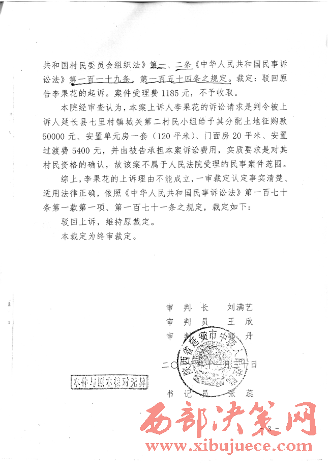 記者又多次翻閱了延長(zhǎng)縣人民法院(2016)陜0621號(hào)民初541號(hào)民事裁定書(shū)和延安市中級(jí)法院(2016)陜06民終1658號(hào)民事裁定書(shū),兩級(jí)法院都用同樣的理由是:“李果花的訴訟請(qǐng)求是判令被上訴人延長(zhǎng)縣七里村鎮(zhèn)城關(guān)二村民小組給予其分配土地征購(gòu)款50000元,安置單元房一套(120平米),門(mén)面房20平米,安置過(guò)渡費(fèi)5400元,并由被告承擔(dān)案件訴訟費(fèi)用,實(shí)質(zhì)要求是對(duì)其村民資格的確認(rèn),故該案不屬于人民法院受理的民事案件范圍。”一審法院駁回起訴,二審法院是駁回上訴,維持原判。正如反映人李果花稱(chēng):“我訴訟的是要回我合法的土地征購(gòu)款、安置房、門(mén)面房、安置過(guò)渡費(fèi)。村民的資格確認(rèn),我有的合法的戶(hù)口簿、身份證,又有鎮(zhèn)政府領(lǐng)導(dǎo)、村干部、村民代表的協(xié)議書(shū)還不夠嗎?”