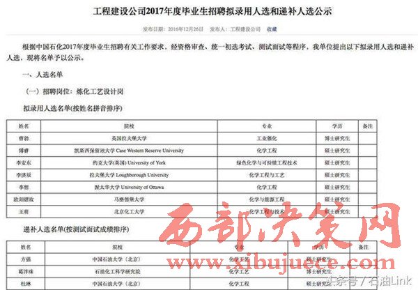 12月26日,中石化在其人才招聘網(http://job.sinopec.com/index.aspx),公布了“中國石化2017年度畢業(yè)生招聘”的擬錄用人選和遞補人選的公示,工程建設公司是這次中石化旗下121家招聘單位里公示的第一家。
