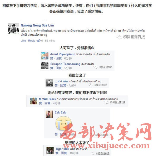 近日,據(jù)泰國網(wǎng)友稱,他的一位朋友因喝酒后頭暈,不慎跌入河道,由于不會水性,因此只能掙扎,并舉手向路人求救,而路人看見后立即沖上前,緩緩掏出手機(jī),開始各角度拍照,生怕自己錯過了什么趣聞,并發(fā)送至臉書平臺,同時貼文表示,一弱智掉水里了,多名網(wǎng)友還回應(yīng)道:“他怎么掉下去的?哈哈哈。”