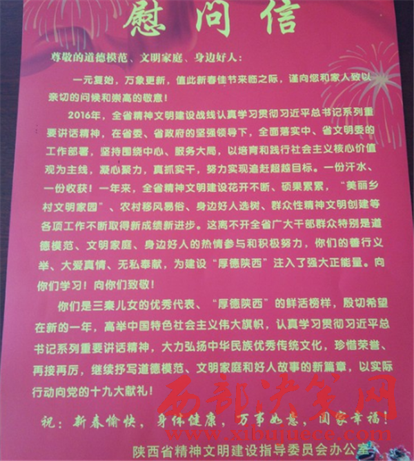 慰問組每到一戶都詳細詢問了模范們的家庭生產(chǎn)和生活狀況,囑咐他們保重身體,希望他們珍惜榮譽,再接再厲,繼續(xù)發(fā)揮模范帶頭作用,在道德建設(shè)上再樹新形象,再展新風采,再創(chuàng)新佳績。同時也號召全縣人民學(xué)好人、做好人,崇尚道德,弘揚善舉率先垂范,樹立榜樣。