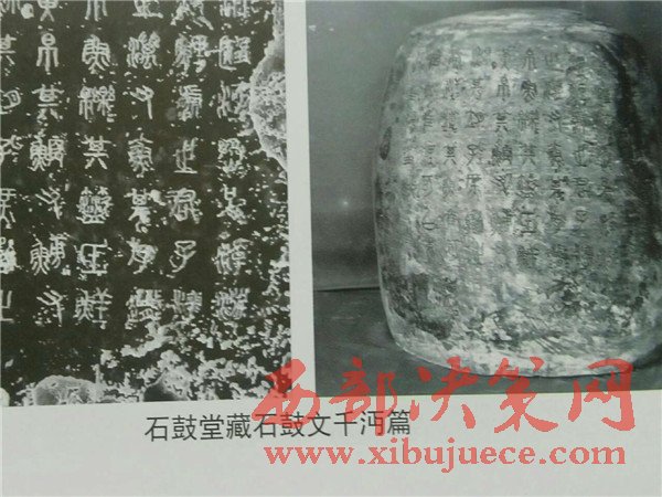 曹老早在40多年前就潛心鉆研石鼓。唐627年,陜西寶雞岐山北坡的荒郊首次發(fā)現(xiàn)石鼓。此地曾是秦朝舊地。共十枚,髙約2尺,徑約3尺,分別刻有大篆四言詩一首,共十首,計718字。定名:車工、千沔、田車、鑾車、霝雨、乍原、吳人、而師、馬薦、吾水。內(nèi)容最早被認(rèn)為是記敘周宣王出獵的場面,后有專家論證為秦時記敘游獵的遺物,故稱“獵碣”。