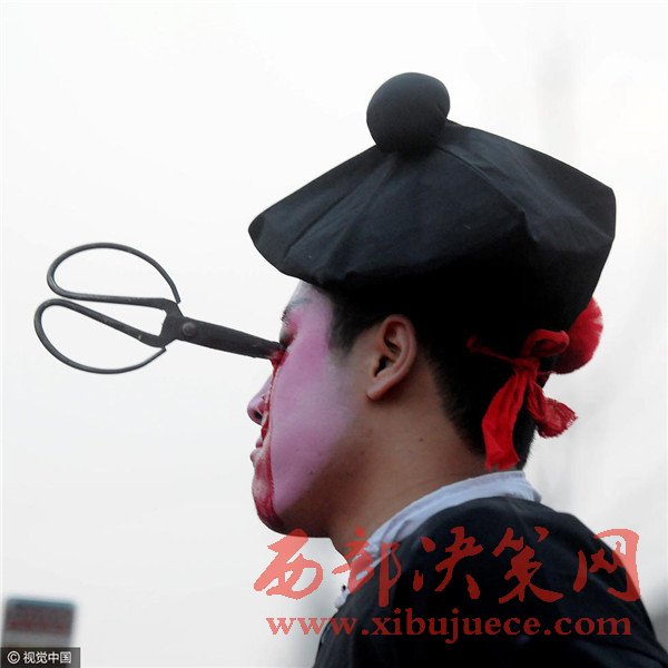 刀具化妝非常神速,一個人的化妝也就三五分鐘,很快就從棚子中走出進入表演現(xiàn)場。一名血社火傳承人介紹:“血社火的秘密就在化妝,而且我們歷來傳男不傳女,更不能隨便向外人透露”。