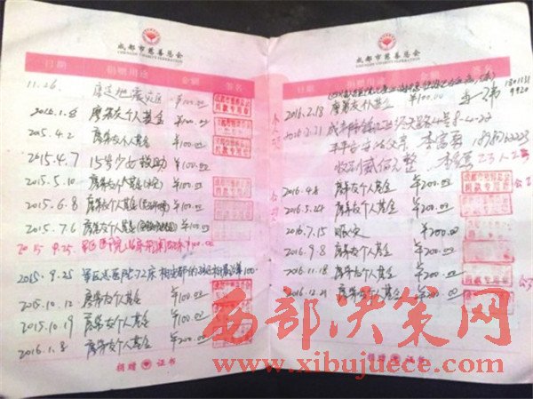 從賑災(zāi)捐款,到為愛助醫(yī),從公眾熟知的“提燈女孩”王思培,到無(wú)人注意的早產(chǎn)雙胞胎,成都慈善總會(huì)為廖弟友發(fā)放的捐款證書上,每一頁(yè)都記著受助者的名字和個(gè)人基金的用途。翻看捐款證書,僅從2011年3月到2016年12月這段時(shí)間內(nèi),廖弟友的捐款次數(shù)達(dá)到58次,最近一次是2016年12月存入個(gè)人慈善基金的記錄。
