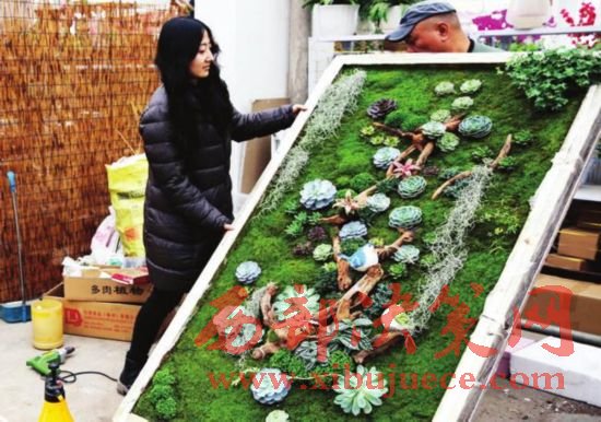 3月13日,西安北二環(huán),經(jīng)過何萌努力創(chuàng)作的這幅多肉風(fēng)景畫已經(jīng)完成。記者看到,整幅畫作高1.9米,寬1米,用60多棵多肉植物及其它綠植組合。何萌說:“我大學(xué)學(xué)的是設(shè)計,畢業(yè)后做過平面設(shè)計,因為喜歡多肉植物便辭掉工作,自己開店賣多肉植物。時間長了總覺得一個一個賣,不但利潤少,也缺乏創(chuàng)意,于是就自己畫畫、寫毛筆字,以設(shè)計稿的方式完成多肉畫作的線稿設(shè)計。”從開始的組裝花盒到現(xiàn)在將多肉做成畫,何萌都全力以赴。
