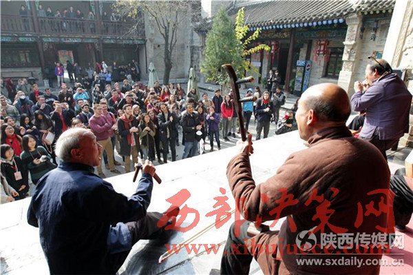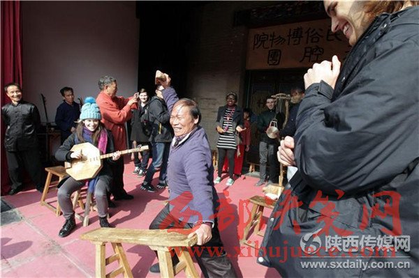 11月15日,北京大學(xué)燕京學(xué)堂的丹麥、以色列等42個(gè)國(guó)家的100多名外國(guó)留學(xué)生,來(lái)到西安了解中國(guó)傳統(tǒng)文化和城市發(fā)展及變化,在關(guān)中民俗藝術(shù)博物院,“老外”對(duì)華陰老腔產(chǎn)生濃厚興趣,現(xiàn)場(chǎng)向老藝人學(xué)唱華陰老腔。