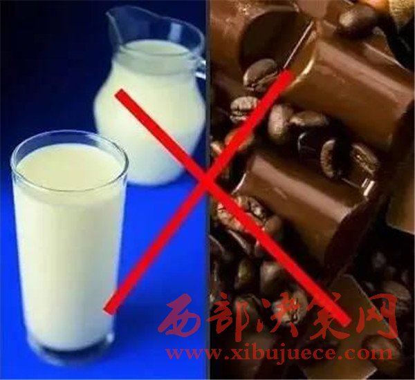 牛奶+巧克力牛奶中的鈣與巧克力中的草酸結(jié)合成草酸鈣,可造成頭發(fā)干枯、腹瀉,出現(xiàn)缺鈣和生長(zhǎng)發(fā)育緩慢。