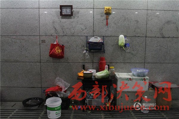 當(dāng)日,武漢市救助管理站的4名工作人員來過,他們勸流浪漢們?nèi)ゾ戎疚此欤缓媒o流浪漢們送來了被子和襖子。圖為流浪漢的廚房。