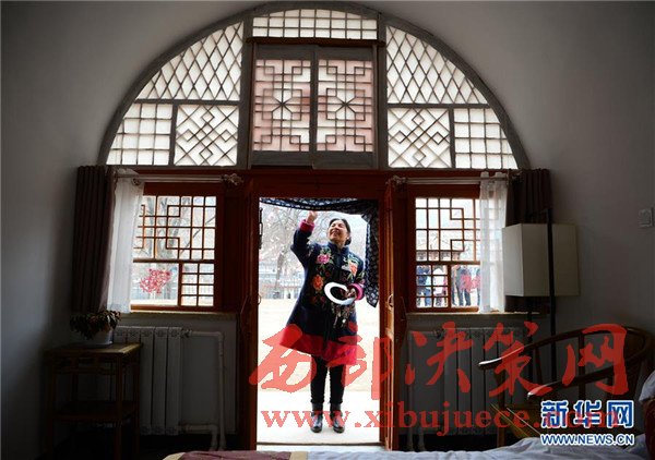 3月15日,佛道坪村村民常鳳蓮在供客人住宿的窯洞門前整理門牌。作為村里旅游項(xiàng)目的服務(wù)人員,常鳳蓮每月可領(lǐng)取2000多元工資。