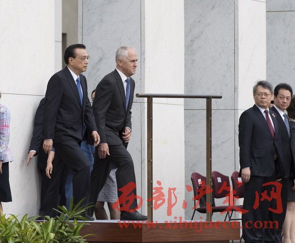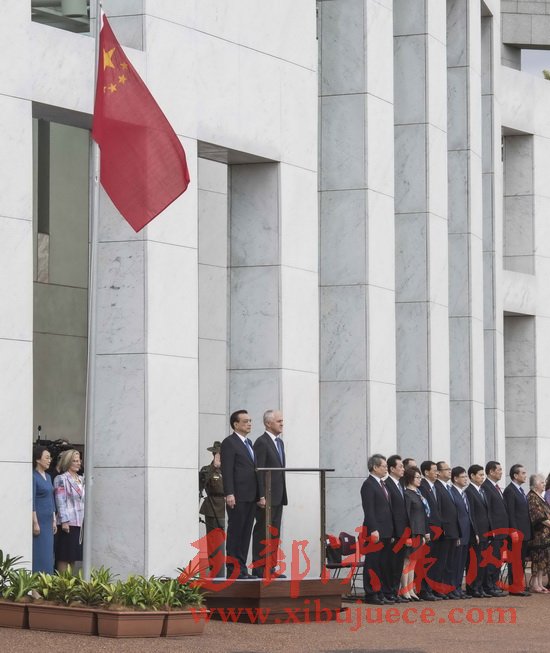 當(dāng)?shù)貢r(shí)間23日上午,澳大利亞總理特恩布爾在堪培拉議會(huì)大廈廣場舉行隆重儀式,歡迎李克強(qiáng)總理對(duì)澳進(jìn)行正式訪問。19響禮炮聲中,特恩布爾夫婦在下車處迎接李克強(qiáng)夫婦。廣場上奏響中國國歌,李克強(qiáng)檢閱了儀仗隊(duì)。兩國總理登上檢閱臺(tái)后,軍樂團(tuán)再次奏響中澳兩國國歌。