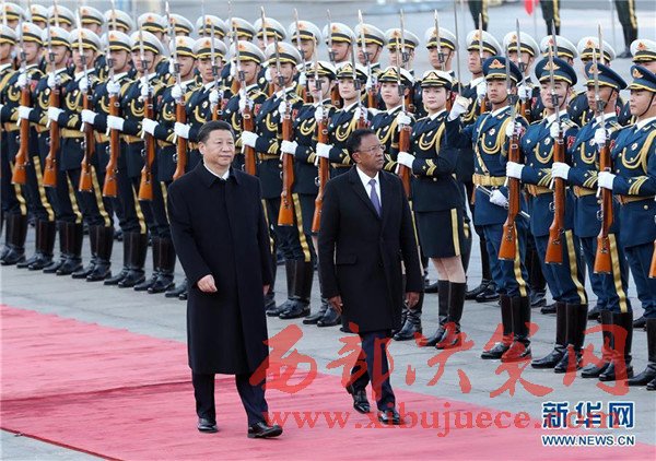 3月27日,國家主席習(xí)近平在北京人民大會(huì)堂同馬達(dá)加斯加總統(tǒng)埃里舉行會(huì)談。這是會(huì)談前,習(xí)近平在人民大會(huì)堂東門外廣場為埃里舉行歡迎儀式。