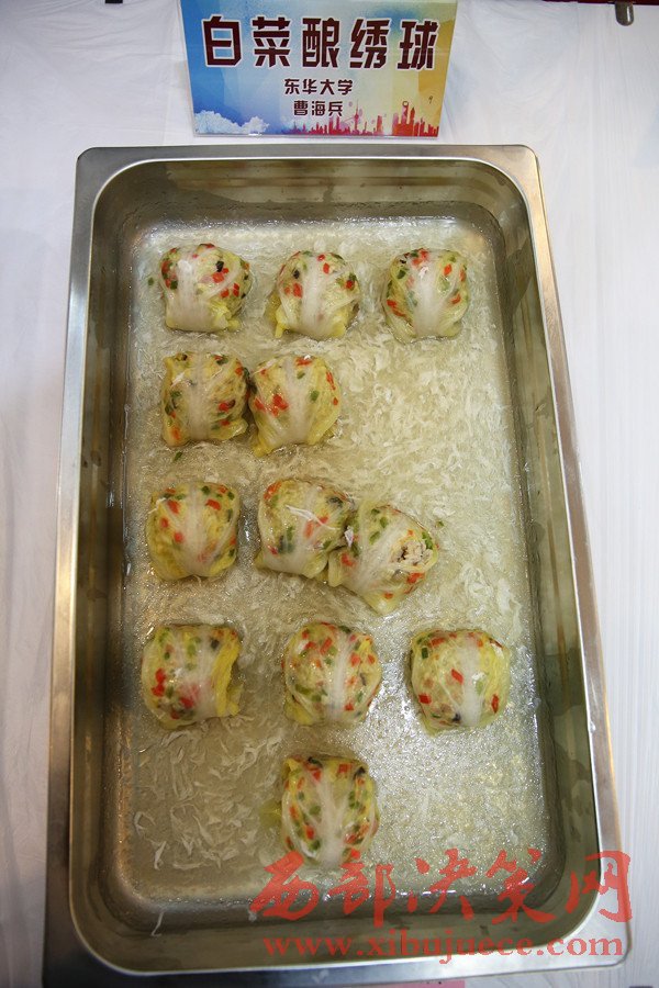 在長達數(shù)個小時的比賽中,來自37所上海高校的100多位廚師輪流上陣,共制作出菜品111個。圖為復(fù)旦大學(xué)一品葫蘆鴨。