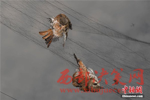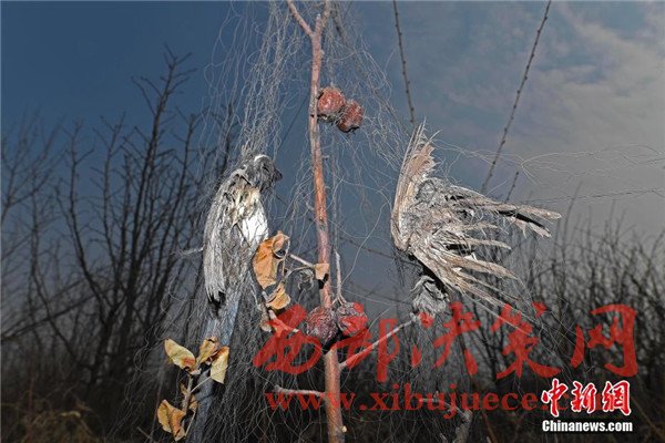 2月14日,山西太原郊區(qū)的一間果園內(nèi),為了保護(hù)農(nóng)作物的果農(nóng)搭建了捕鳥(niǎo)網(wǎng),三百余只不同種類(lèi)的鳥(niǎo)被網(wǎng)圍困致死,有些已腐爛風(fēng)干。