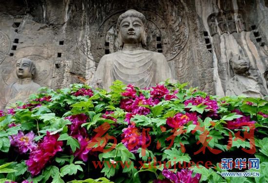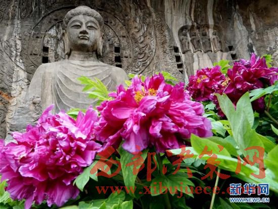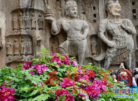 目前正值洛陽牡丹的盛花期,洛陽龍門石窟景區(qū)內(nèi)的近萬株牡丹爭奇斗艷,與古老的石刻佛像共同構(gòu)成獨特的風景。