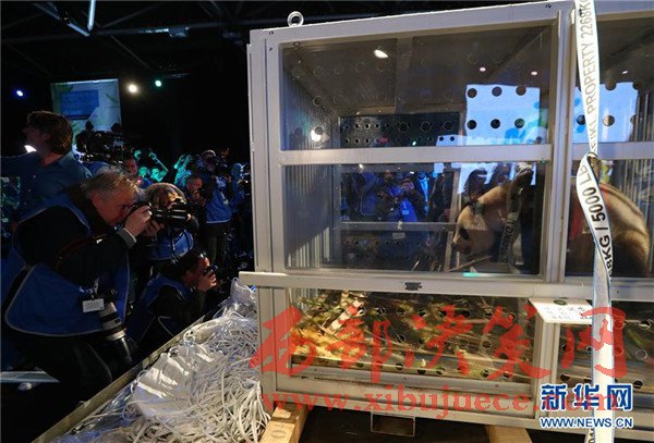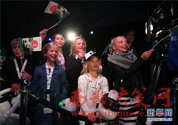 4月12日,在荷蘭首都阿姆斯特丹史基浦機場,記者們拍攝大熊貓。