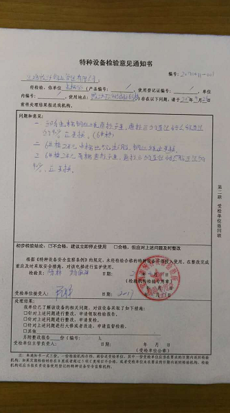 經過特檢所現(xiàn)場檢驗,發(fā)現(xiàn)三部電梯鋼絲繩磨損嚴重,6號樓2單元中梯、北梯鋼絲均出現(xiàn)斷股,現(xiàn)場建議更換鋼絲繩,后出具特種設備檢驗意見通知書,對于檢查出的問題要求立即停止使用。