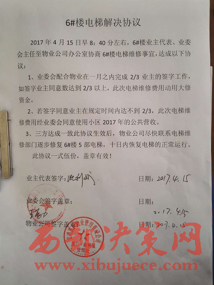 最新進展:4月15日,業(yè)主委員會和凱躍物業(yè)達成維修協(xié)議,業(yè)委會配合物業(yè)在一月之內完成2/3 業(yè)主的簽字工作,電梯維修費使用大修資金。如果在規(guī)定時間內達不到2/3業(yè)主簽字,則使用小區(qū)2017年的公共營收。三方協(xié)議達成后,由凱躍物業(yè)盡快聯(lián)系電梯維修公司,十日內恢復電梯的正常運行。