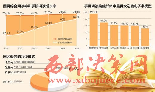 中國(guó)新聞出版研究院18日公布了第十四次全國(guó)國(guó)民閱讀調(diào)查的主要情況。調(diào)查顯示,2016年我國(guó)成年國(guó)民各媒介綜合閱讀率為79.9%,較2015年的79.6%略有提升,數(shù)字化閱讀方式的接觸率為68.2%,較2015年的64.0%上升了4.2個(gè)百分點(diǎn),圖書閱讀率為58.8%,較2015年的58.4%上升了0.4個(gè)百分點(diǎn)。2016年我國(guó)成年國(guó)民人均圖書閱讀量為7.86本,較2015年增加了0.02本。2016年手機(jī)閱讀率達(dá)到66.1%,已經(jīng)連續(xù)8年增長(zhǎng)。