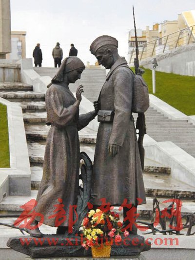 白俄羅斯衛(wèi)國戰(zhàn)爭歷史博物館入口處,立著一座雕像,背著槍的紅軍戰(zhàn)士正同心愛的姑娘依依惜別,雕像前常年鮮花不斷