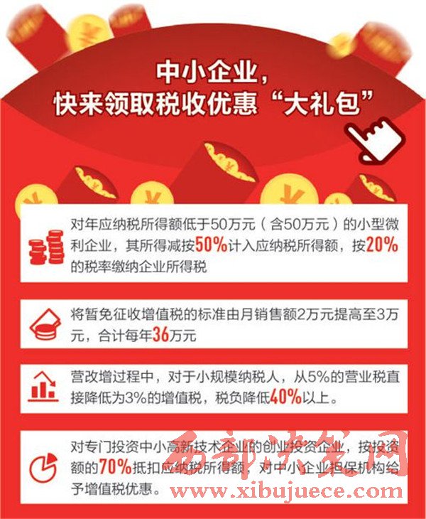 日前國務(wù)院常務(wù)會議決定,在今年已出臺4批政策減稅降費7180億元的基礎(chǔ)上,繼續(xù)出臺多項降費舉措,預(yù)計每年可再減輕企業(yè)負(fù)擔(dān)2830億元,合計全年為企業(yè)減負(fù)超過1萬億元。今年以來,國家持續(xù)推出減稅降費措施,讓企業(yè)輕裝上陣,成為推進(jìn)供給側(cè)結(jié)構(gòu)性改革、培育我國競爭新優(yōu)勢的重要舉措。就在國務(wù)院出臺多項降費舉措的同時,財政部、國家稅務(wù)總局也發(fā)出通知,將享受所得稅優(yōu)惠政策的小型微利企業(yè)年應(yīng)納稅所得額上限由30萬元提高至50萬元,自2017年1月1日至2019年12月31日,對年應(yīng)納稅所得額低于50萬元(含50萬元)的小型微利企業(yè),其所得減按50%計入應(yīng)納稅所得額,按20%的稅率繳納企業(yè)所得稅。