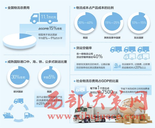 單線成本不高,但綜合成本高,主因在于不必要的搬倒騰挪而產(chǎn)生的流通費(fèi)用。一些物流公司的貨車空載率近40%,比發(fā)達(dá)國(guó)家高4倍甚至更多,一邊是“車等貨”,一邊是“貨等車”