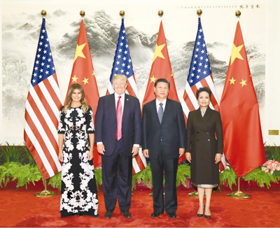 11月9日,國(guó)家主席習(xí)近平在北京人民大會(huì)堂東門外廣場(chǎng)舉行歡迎儀式,歡迎美利堅(jiān)合眾國(guó)總統(tǒng)唐納德·特朗普對(duì)中國(guó)進(jìn)行國(guó)事訪問。這是習(xí)近平和夫人彭麗媛在人民大會(huì)堂同特朗普夫婦合影。(記者 蘭紅光 攝)