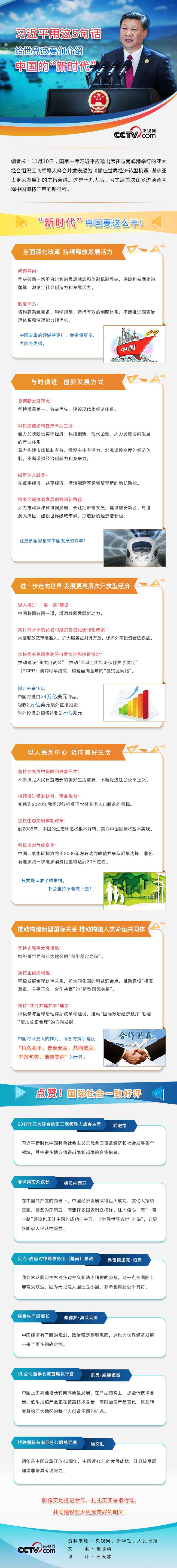 11月10日,國家主席習(xí)近平應(yīng)邀出席在越南峴港舉行的亞太經(jīng)合組織工商領(lǐng)導(dǎo)人峰會(huì)并發(fā)表題為《抓住世界經(jīng)濟(jì)轉(zhuǎn)型機(jī)遇 謀求亞太更大發(fā)展》的主旨演講。這是十九大后,習(xí)主席首次在多邊場合闡釋中國即將開啟的新征程。