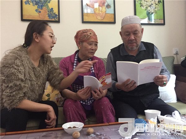 傍晚,一大群來自不同民族,不同單位的新疆兒女聚在了一起,紛紛加入到這個(gè)民族團(tuán)結(jié)的大聚會(huì)里,彈一首歡快悅耳的冬不拉,舞一曲深情優(yōu)美的賽乃姆,唱一首民族團(tuán)結(jié)的贊歌,將整個(gè)聚會(huì)推向高潮。賽買提·阿合買提高興地說:“我今天太開心了!這個(gè)結(jié)婚紀(jì)念日太有意義了,你的親戚,我的親戚,變成了我們的親戚,以后這就是你們的家,你們要經(jīng)常來?。?rdquo; 趁著大家都在興頭上,韓莉書記又拿出學(xué)校專門印制的《不忘初心 牢記使命-黨的十九大精神進(jìn)校園讀本》,熱情地為親戚們宣傳起十九大精神,給大家講起黨的好政策來。在得知艾來提·賽買提目前還沒有找到合適的工作,沒有穩(wěn)定收入的情況后,大家立刻表示愿意幫助他早日找到合適的工作,幫助他們解決最實(shí)際的困難,把溫暖送到他們的心坎中。大家唱唱跳跳,說說笑笑,其樂融融,在互幫互助中讓民族團(tuán)結(jié)之花越開越艷。