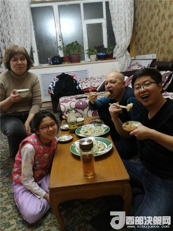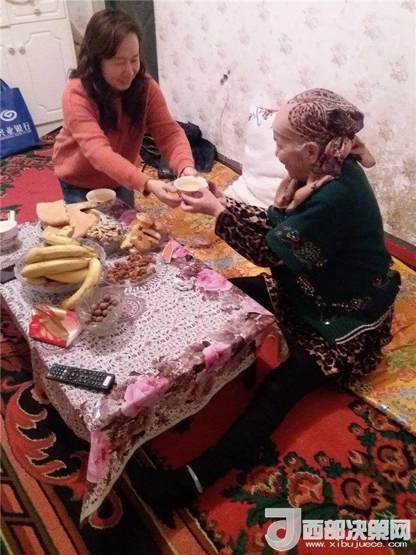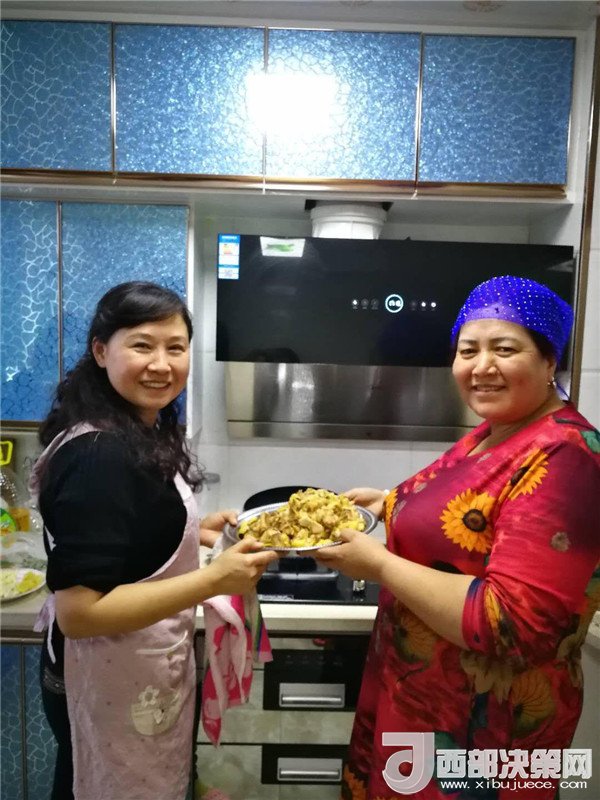 艾來提·賽買提的父親賽買提·阿合買提一面接過韓莉書記手里的米、面、清油和兩大兜食材,一面心疼地埋怨:“這么冷的天,你們又拿這么多東西,多辛苦,你上次送來的東西還沒有吃完呢。”韓莉和王艷萍笑而不語,心里默默地盤算著帶給親戚意外的驚喜。因?yàn)榘瑏硖?middot;賽買提和愛人長期兩地分居,聚少離多。今天正好是他們父母結(jié)婚三十周年紀(jì)念日,她們?nèi)嗽缇蜕塘亢靡欢ㄒH手做一頓飯,邀請(qǐng)這個(gè)民族團(tuán)結(jié)大院里附近的同事和各自的親戚一起來給這個(gè)小家庭舉辦一場(chǎng)別開生面的大融合聚會(huì),她們忙碌著,擇、洗、炒,撲鼻的香味彌漫在親戚的家中……
