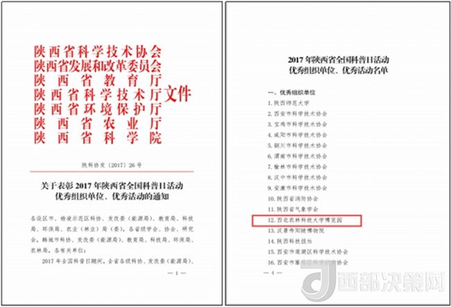 近日,陜西省科協(xié)、省發(fā)改委、省教育廳、省科技廳、省環(huán)保廳、省農(nóng)業(yè)廳和省科學(xué)院聯(lián)合發(fā)布了《關(guān)于表彰2017年陜西省全國(guó)科普日活動(dòng)優(yōu)秀組織單位、優(yōu)秀活動(dòng)的通知》,西北農(nóng)林科技大學(xué)博覽園獲評(píng)2017年全國(guó)科普日活動(dòng)優(yōu)秀組織單位。