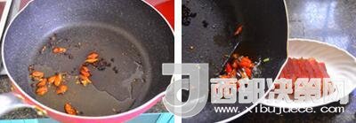 3、起油鍋,放入花椒和朝天椒、蒜末炒香,澆在臘肉上。